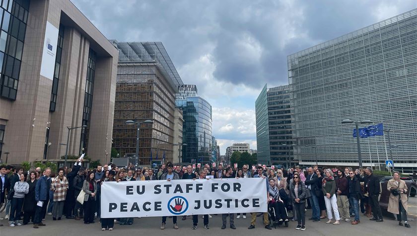 One of them is reading out the names of Palestinian children killed in Israel’s offensive in Gaza. Others are holding banners that read “EU staff for peace and justice” and “EU staff for immediate ceasefire”.