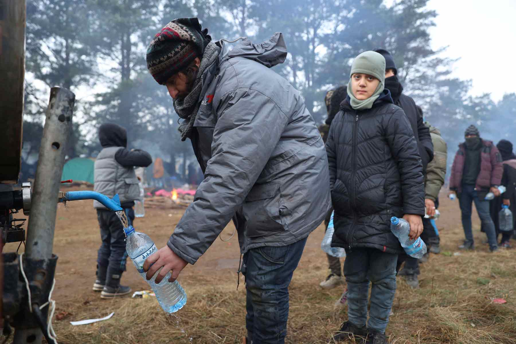 Belarus, 2021 Migrants collect drinking water at the Polish-Belarus border, near Grodno